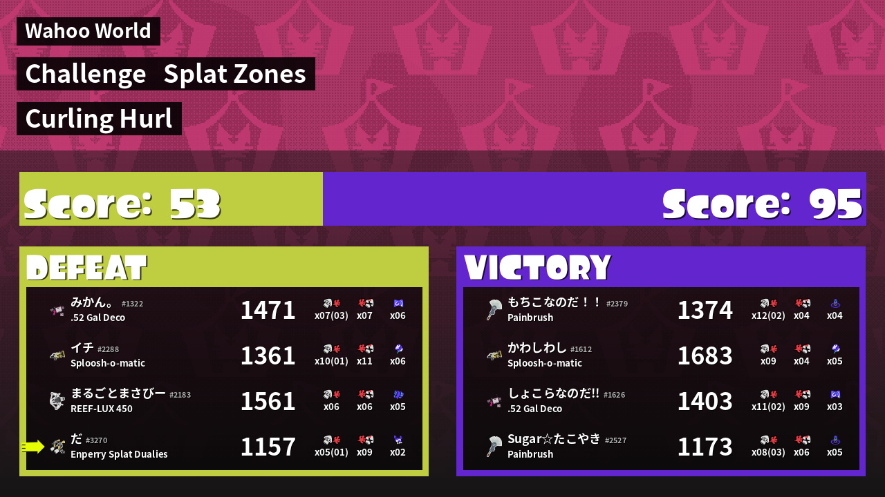 | Medals | #1 Damage Taker #2 Splat Zone Inker #2 Popular Target | ||