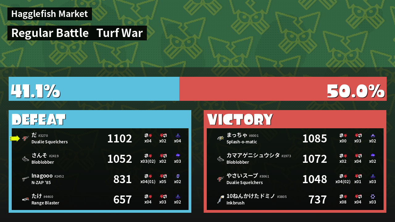 | Medals | #1 Overall Splatter #1 Turf Inker #1 Enemy Splatter | ||