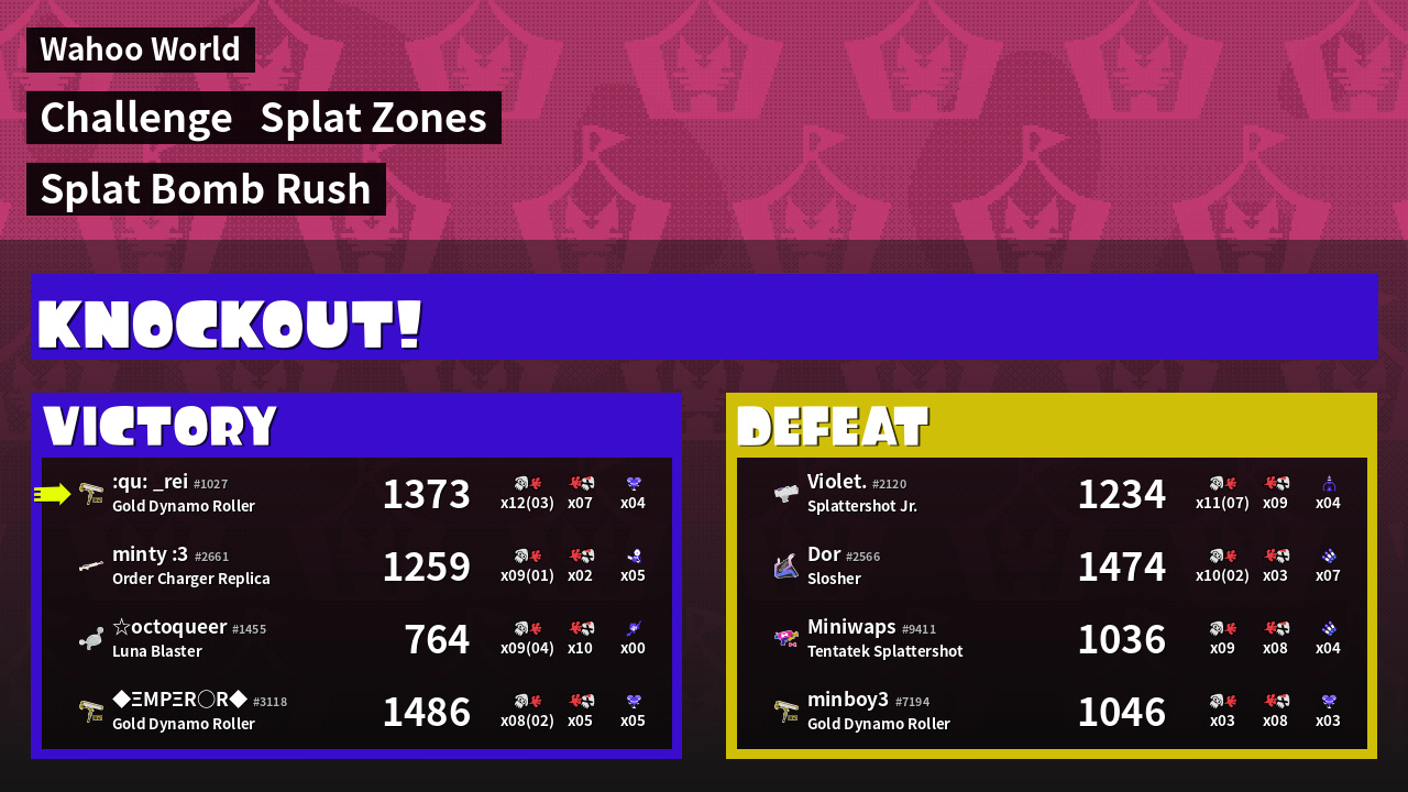 | Medals | #1 Overall Splatter #1 Splat Zone Guard #1 Enemy Splatter | ||