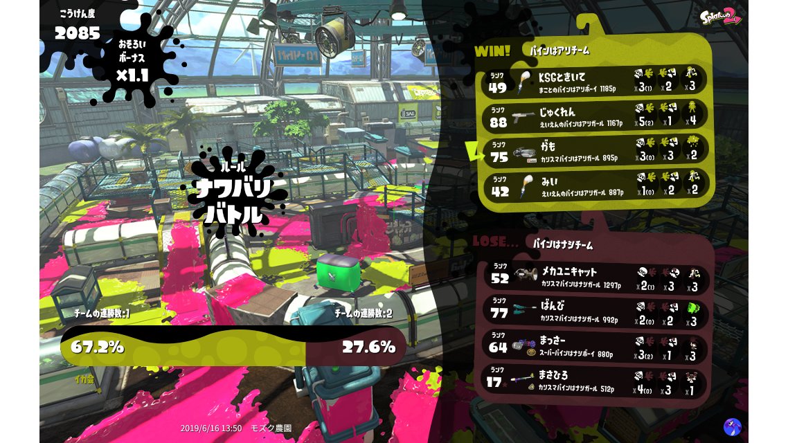 | Team パインはアリ イカ会 Win Streak: 1 | 4,134 | 9 / 8 | 1.12 52.94% | ||||
