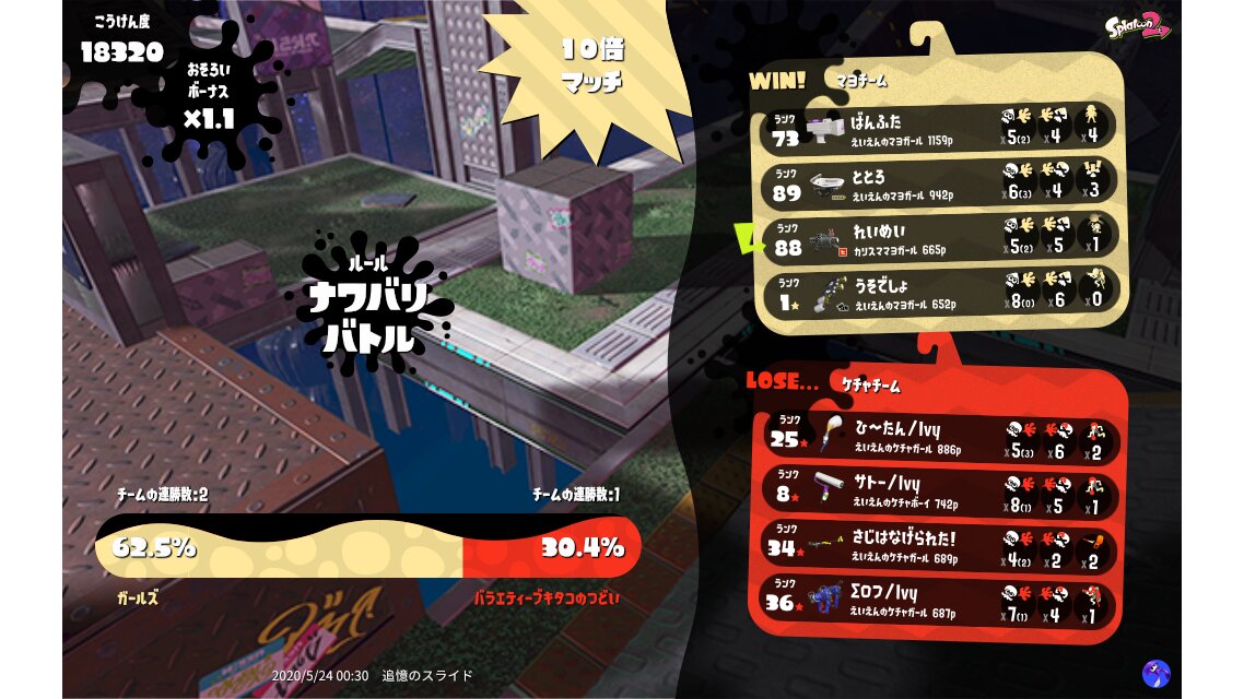 | Team マヨ ガールズ Win Streak: 2 | 3,418 | 17 / 19 | 0.89 47.22% | ||||