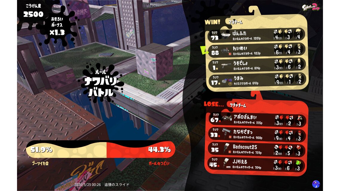 | Team マヨ ブーツイカ会 Win Streak: 0 | 3,629 | 16 / 14 | 1.14 53.33% | ||||