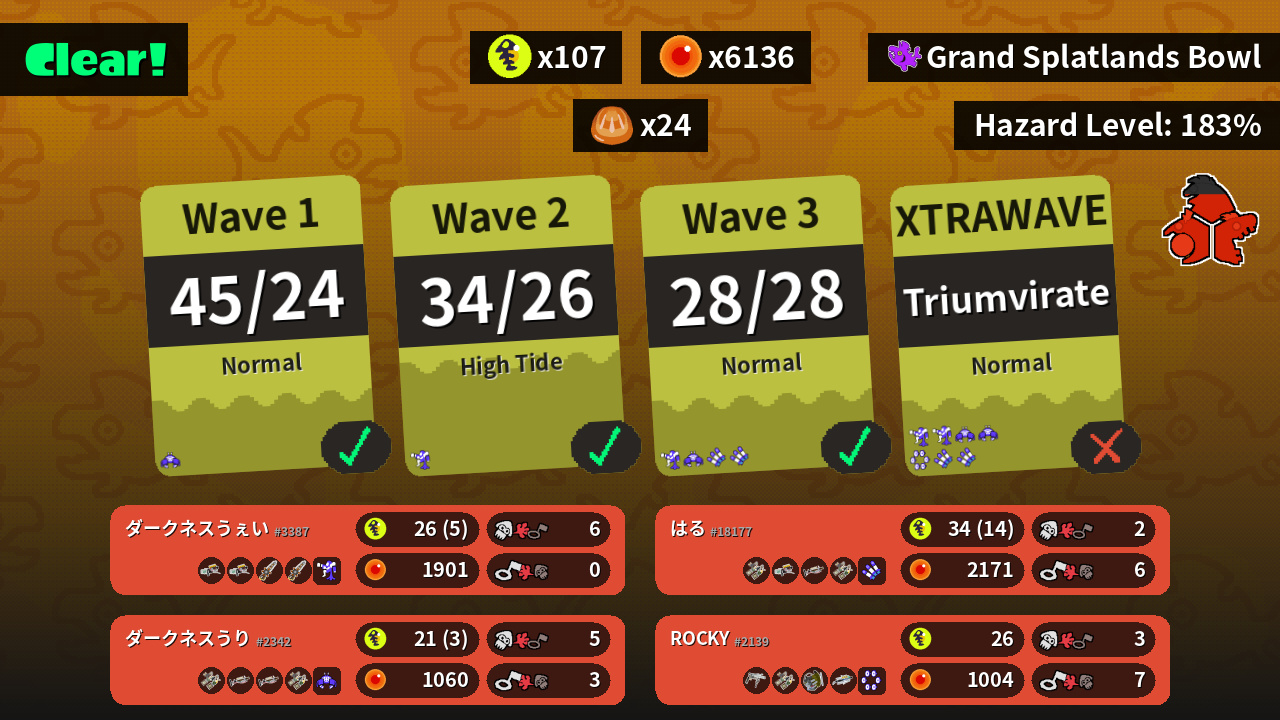 | Weapons | Grizzco Blaster Grizzco Blaster Grizzco Splatana Grizzco Splatana | Grizzco Dualies Grizzco Blaster Grizzco Charger Grizzco Dualies | Grizzco Roller Grizzco Dualies Grizzco Slosher Grizzco Brella | Grizzco Dualies Grizzco Charger Grizzco Charger Grizzco Dualies |