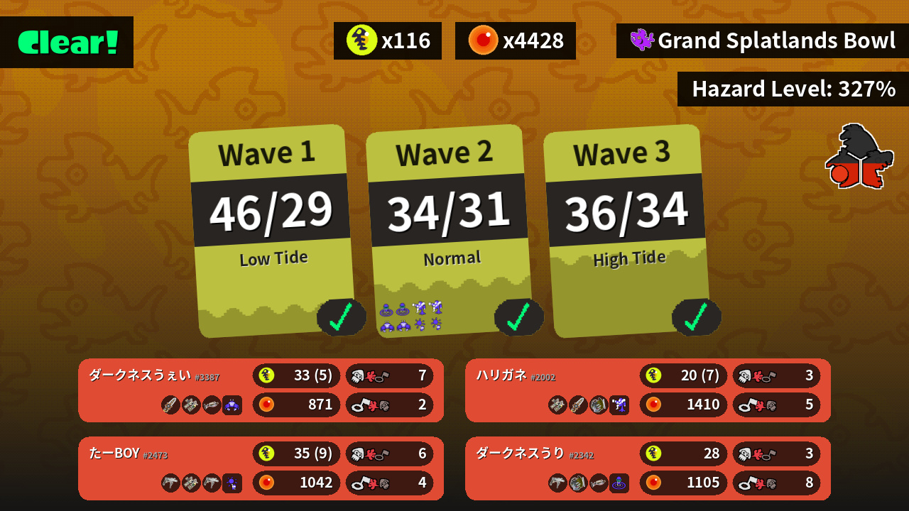 | Weapons | Grizzco Splatana Grizzco Dualies Grizzco Charger | Grizzco Roller Grizzco Dualies Grizzco Roller | Grizzco Roller Grizzco Slosher Grizzco Charger | Grizzco Dualies Grizzco Splatana Grizzco Slosher |
