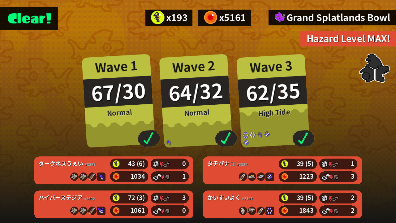| Weapons | Grizzco Dualies Grizzco Dualies Grizzco Splatana | Grizzco Dualies Grizzco Dualies Grizzco Splatana | Grizzco Stringer Grizzco Roller Grizzco Splatana | Grizzco Splatana Grizzco Blaster Grizzco Brella |