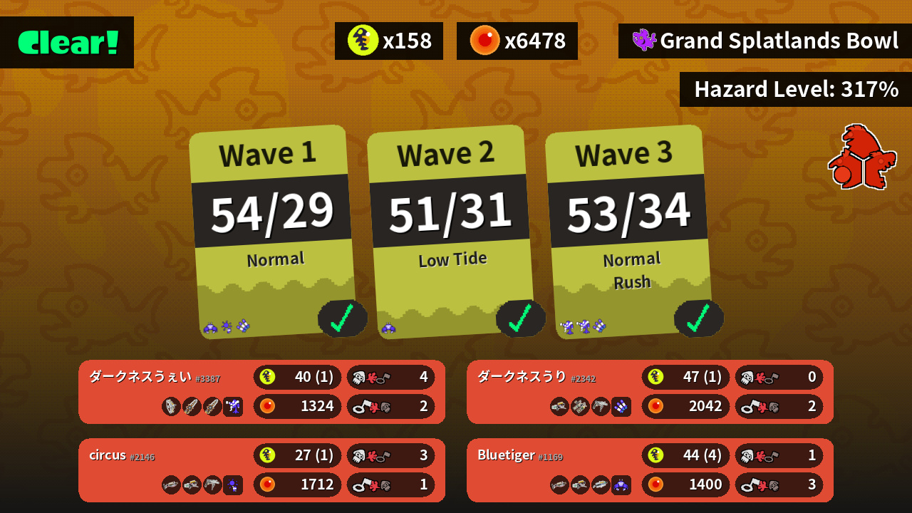 | Weapons | Grizzco Stringer Grizzco Splatana Grizzco Splatana | Grizzco Blaster Grizzco Dualies Grizzco Roller | Grizzco Charger Grizzco Blaster Grizzco Brella | Grizzco Charger Grizzco Blaster Grizzco Roller |