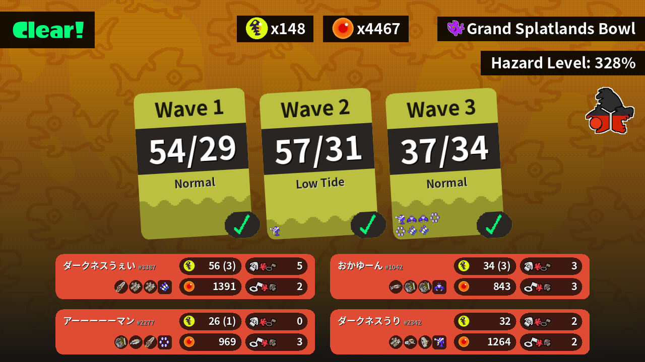 | Weapons | Grizzco Splatana Grizzco Dualies Grizzco Dualies | Grizzco Charger Grizzco Slosher Grizzco Slosher | Grizzco Dualies Grizzco Blaster Grizzco Stringer | Grizzco Slosher Grizzco Brella Grizzco Splatana |