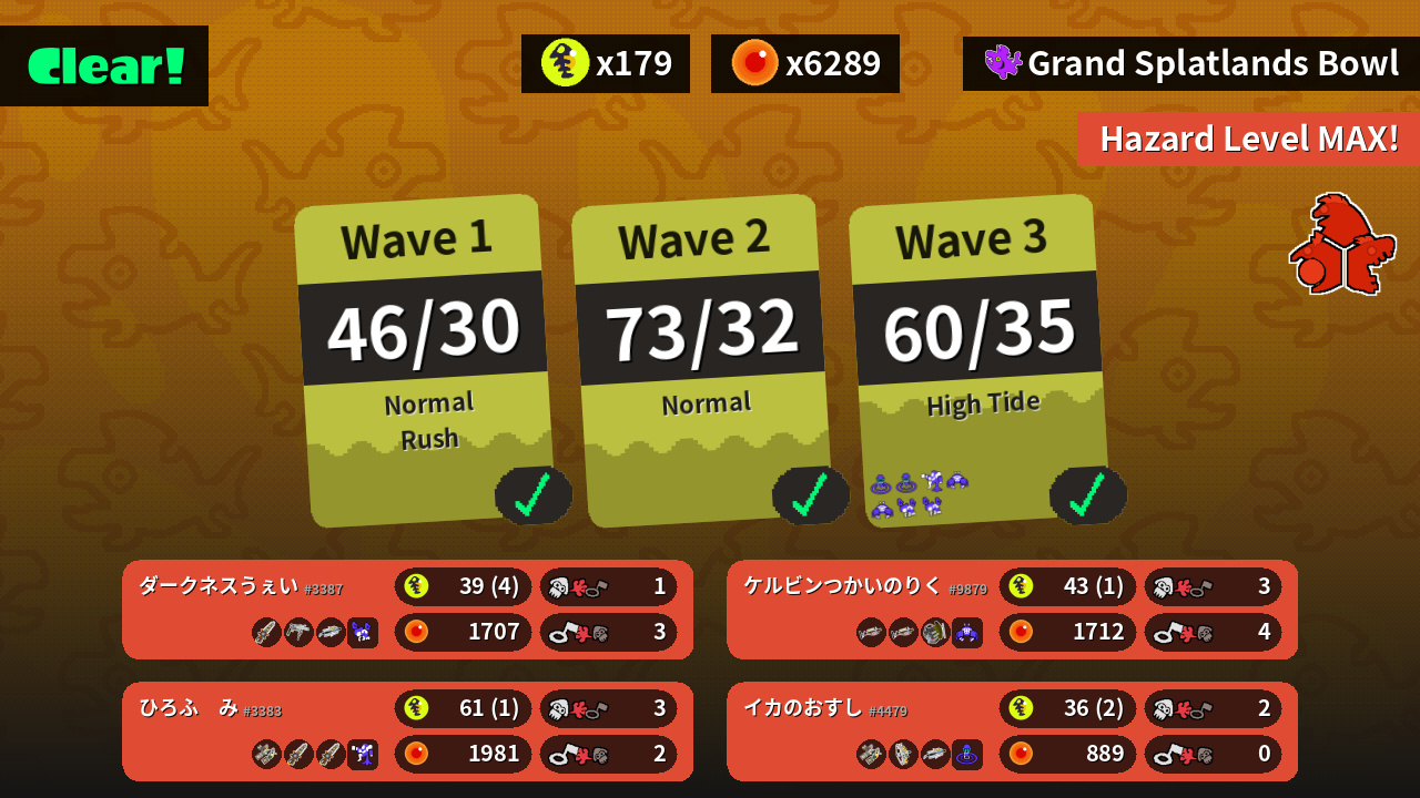 | Weapons | Grizzco Splatana Grizzco Roller Grizzco Brella | Grizzco Dualies Grizzco Splatana Grizzco Splatana | Grizzco Charger Grizzco Charger Grizzco Slosher | Grizzco Dualies Grizzco Stringer Grizzco Brella |