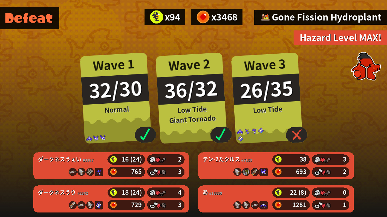 | Weapons | Grizzco Charger Grizzco Stringer Grizzco Dualies | Grizzco Stringer Grizzco Slosher Grizzco Splatana | Grizzco Stringer Grizzco Stringer Grizzco Charger | Grizzco Splatana Grizzco Charger Grizzco Stringer |