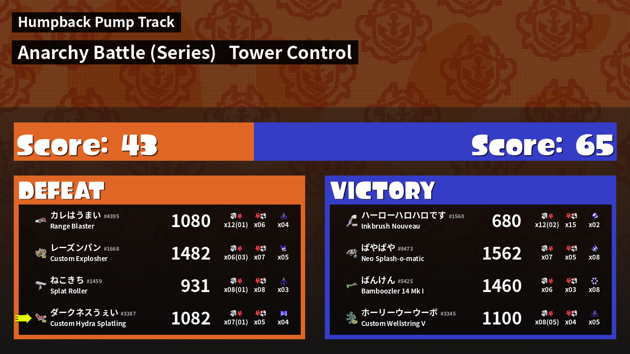 | Medals | #1 Splattercolor Screen User #2 Turf Inker #2 Splat Assister | ||