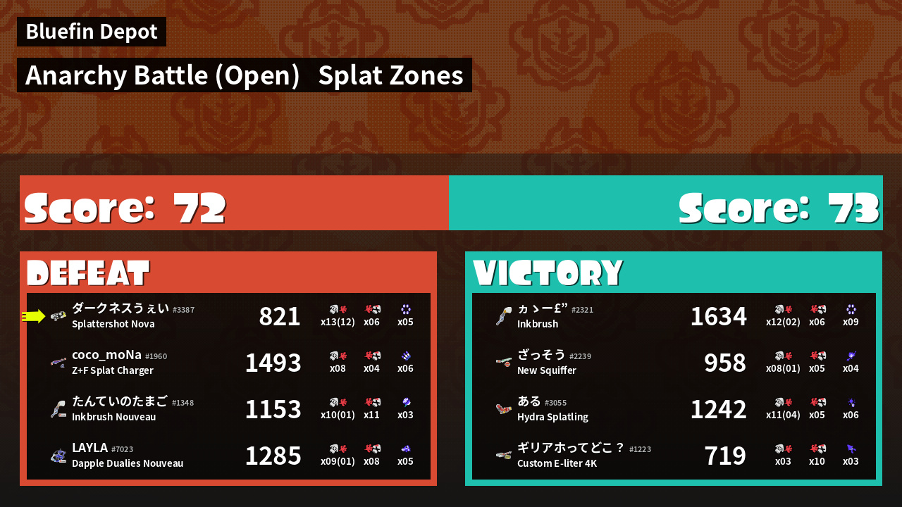 | Mode | Splat Zones - Anarchy Battle (Open) | ||