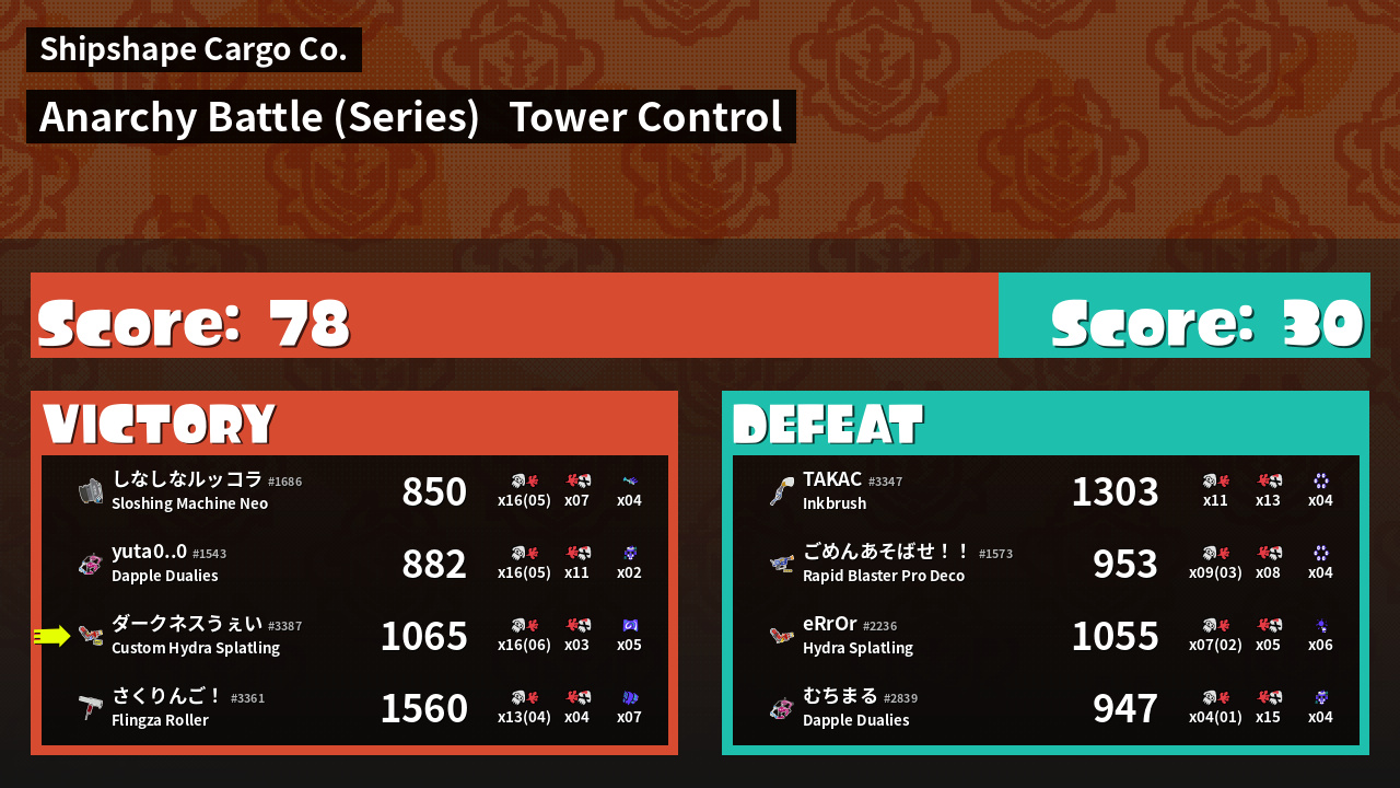 | Medals | #1 Overall Splatter #1 Splat Assister #1 Tower Stopper | ||