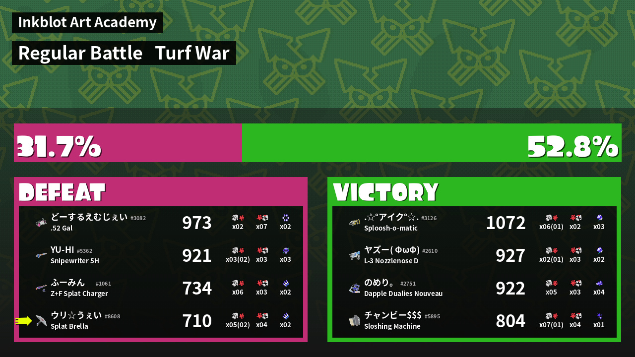 | Medals | #1 Splat Assister #1 Base Defender #2 Overall Splatter | ||