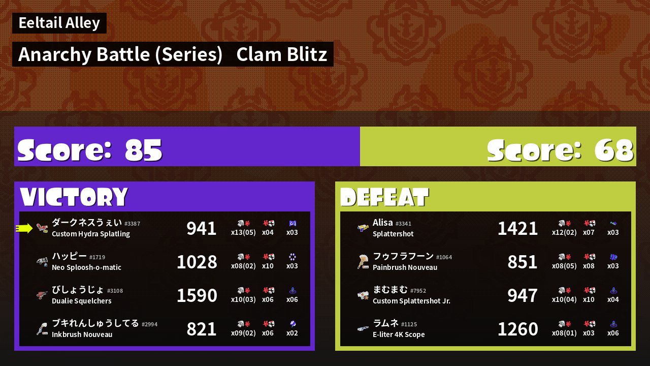 | Medals | #1 Overall Splatter #1 Clam Carrier #1 Popular Target | ||