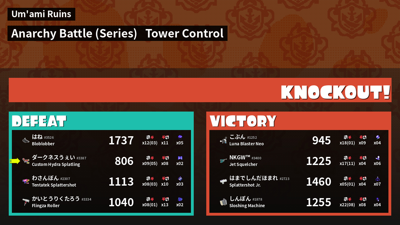 | Medals | #1 Super Jump Spot #1 Splat Assister #1 Tower Stopper | ||