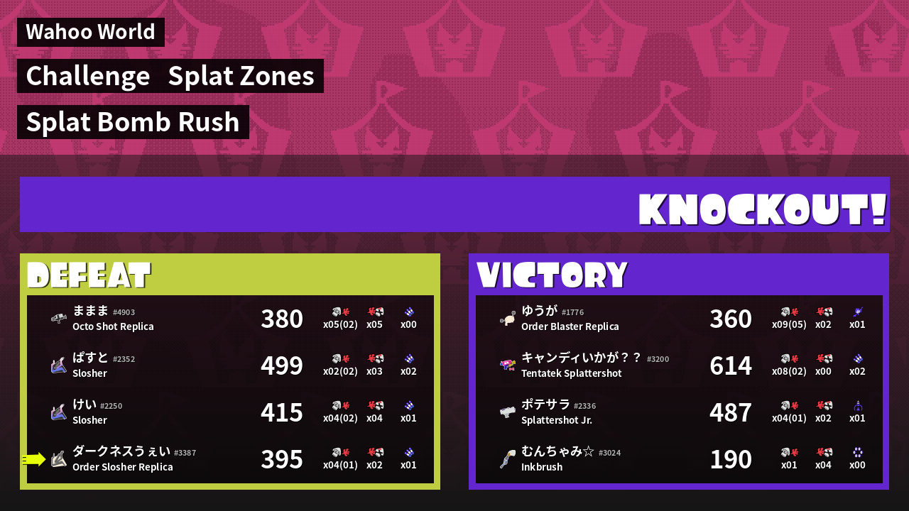| Challenge | Splat Bomb Rush Let the Splat Bombs fly in this free-for-all! | ||