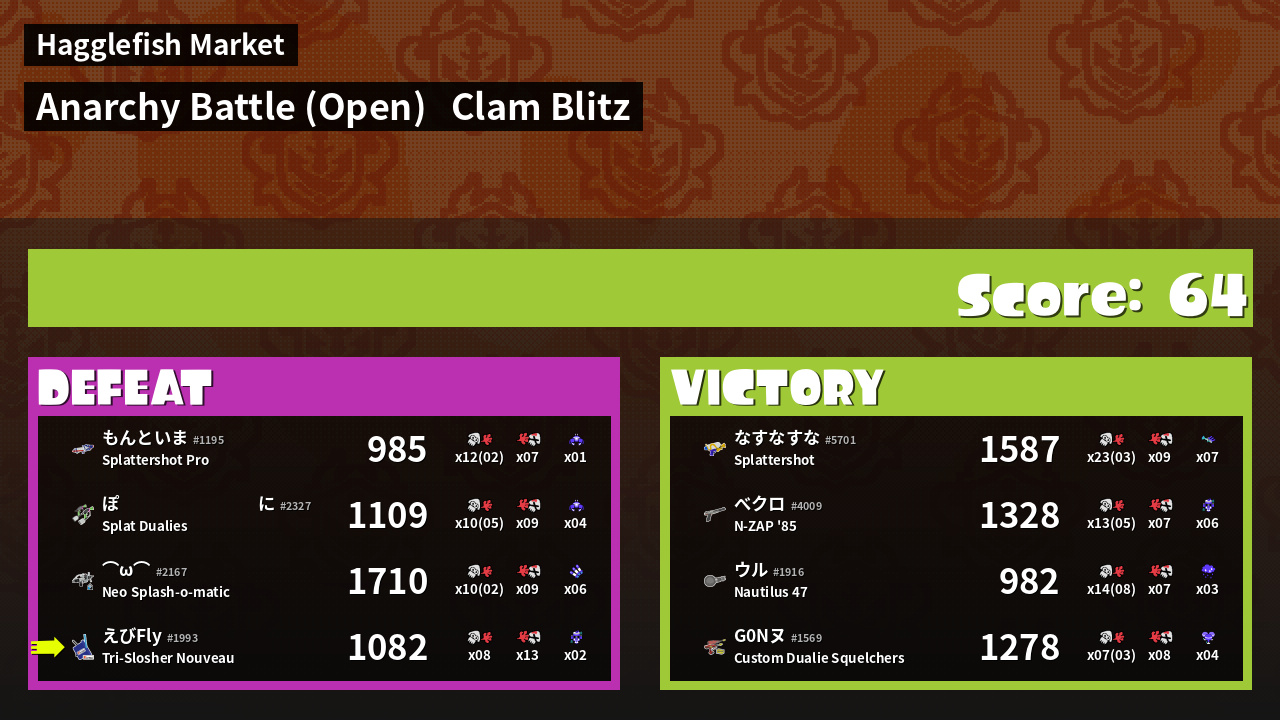| Mode | Clam Blitz - Anarchy Battle (Open) | ||