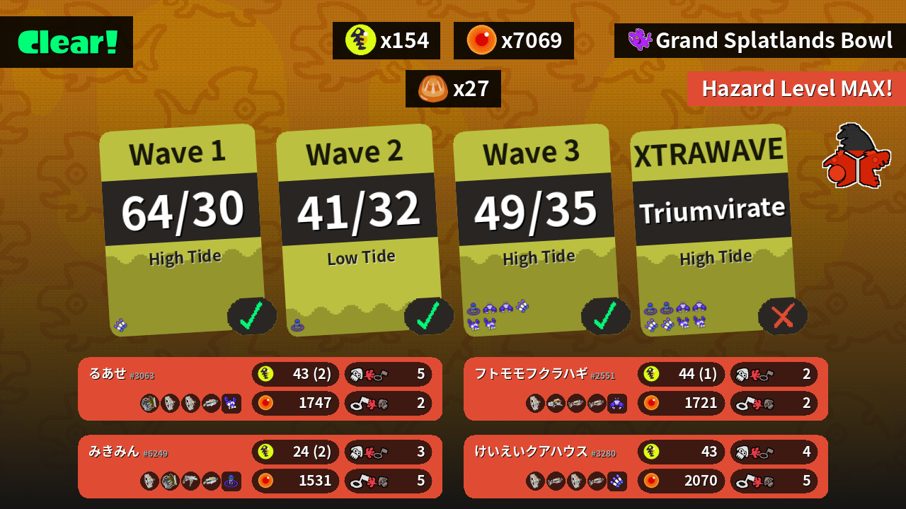 | Weapons | Grizzco Slosher Grizzco Stringer Grizzco Stringer Grizzco Brella | Grizzco Stringer Grizzco Blaster Grizzco Charger Grizzco Charger | Grizzco Stringer Grizzco Charger Grizzco Stringer Grizzco Charger | Grizzco Stringer Grizzco Slosher Grizzco Roller Grizzco Brella |