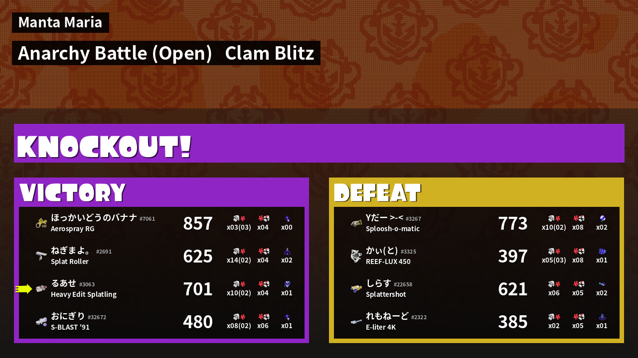 | Mode | Clam Blitz - Anarchy Battle (Open) |