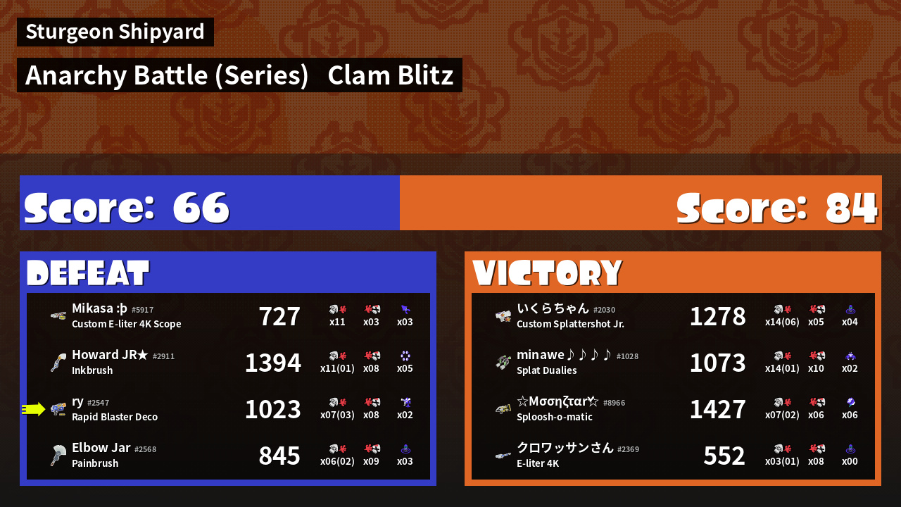 | Medals | #1 Clam Carrier #1 Splat Assister #2 Score Booster | ||