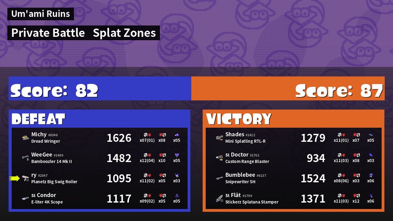 | Medals | #1 Splat Zone Guard #1 Enemy Splatter #1 Splat Zone Hero | ||