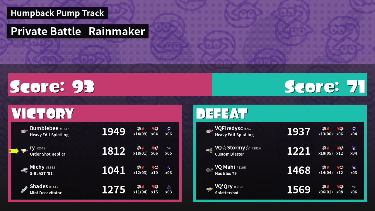 | Medals | #1 Overall Splatter #1 Enemy Splatter #1 Trizooka User | ||