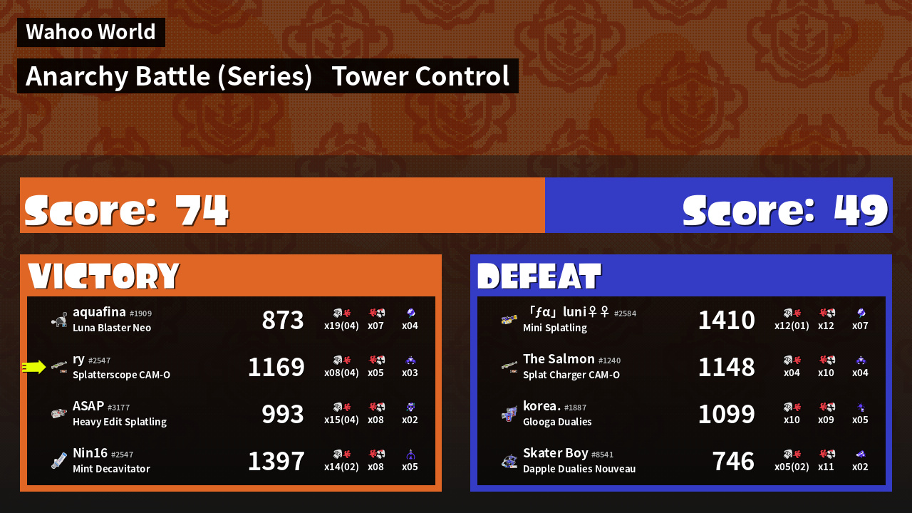 | Medals | Record-Score Setter #1 Super Jump Spot #1 Splat Assister | ||