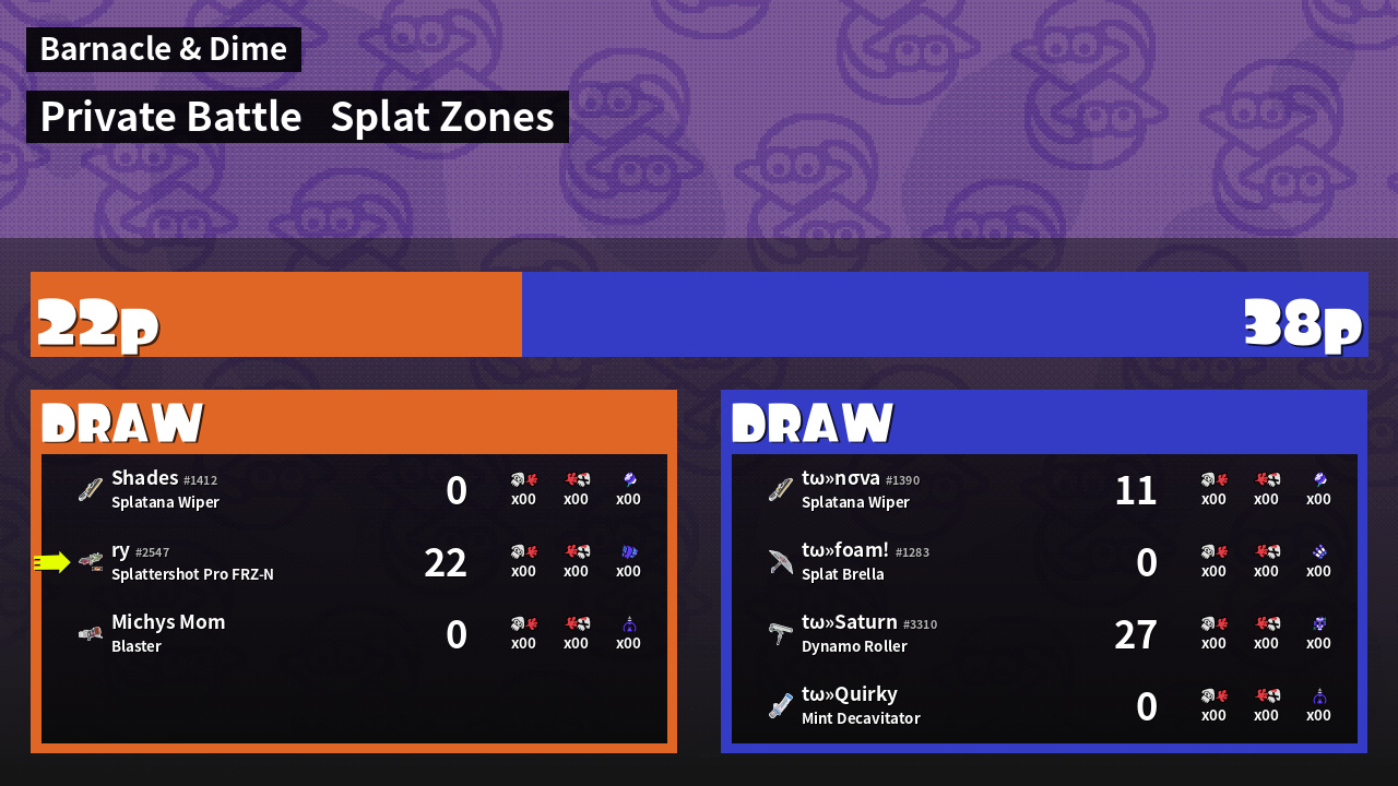 | Mode | Splat Zones - Private Battle | ||