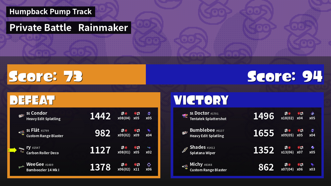 | Weapon | Carbon Roller Deco ( Burst Bomb / Trizooka) | ||