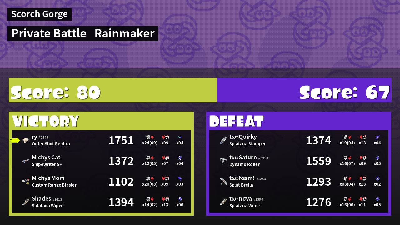 | Medals | #1 Overall Splatter #1 Turf Inker #1 Enemy Splatter | ||