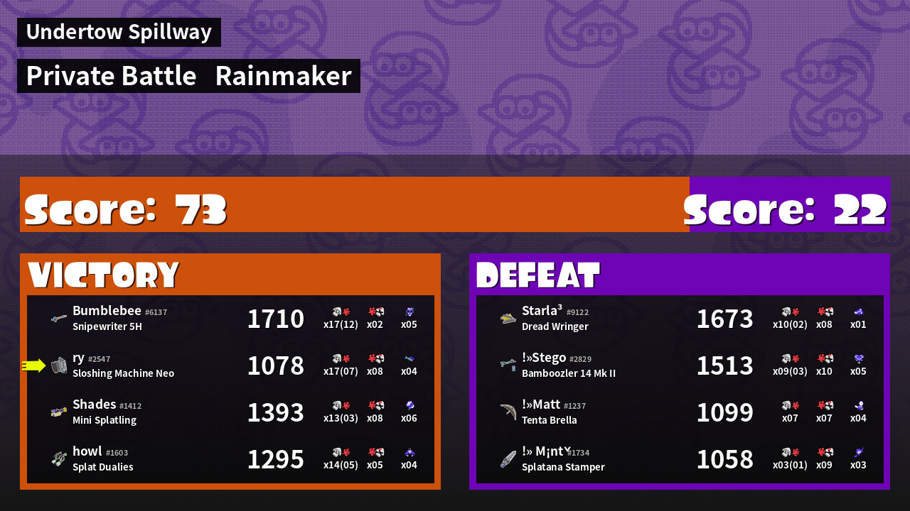 | Medals | #1 Overall Splatter #1 Enemy Splatter #1 Trizooka User | ||