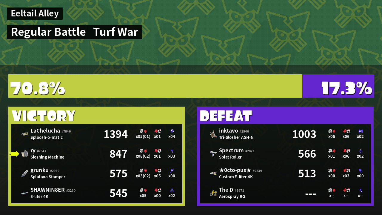 | Medals | #1 Overall Splatter #1 Enemy-Base Inker #1 Enemy Splatter | ||