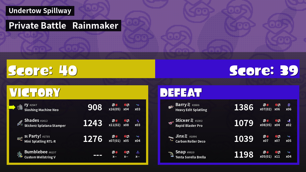 | Medals | #1 Overall Splatter #1 Popular Target #1 Enemy Splatter | ||