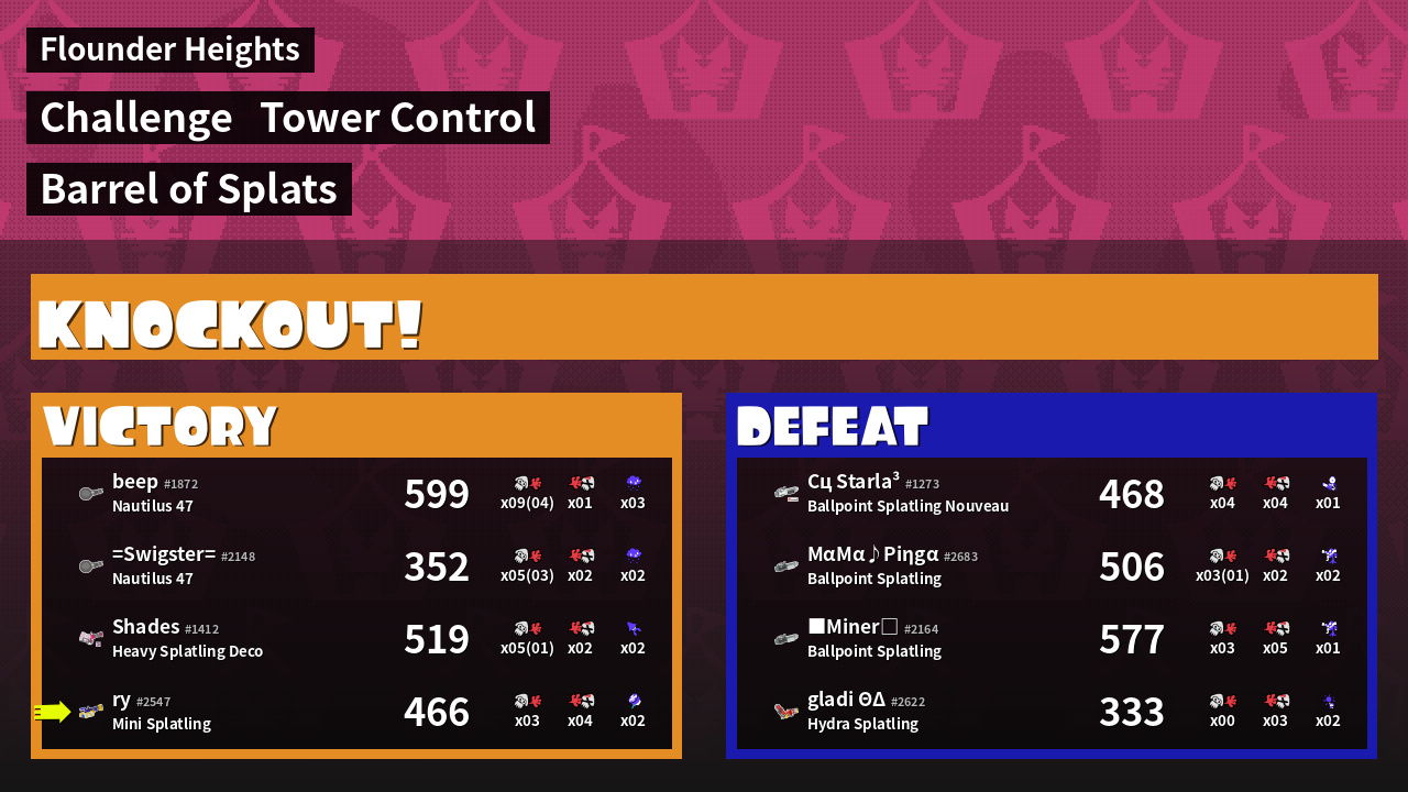 Challenge | Barrel of Splats Muster as much firepower as you can<br />in this battle of the splatlings! | ||