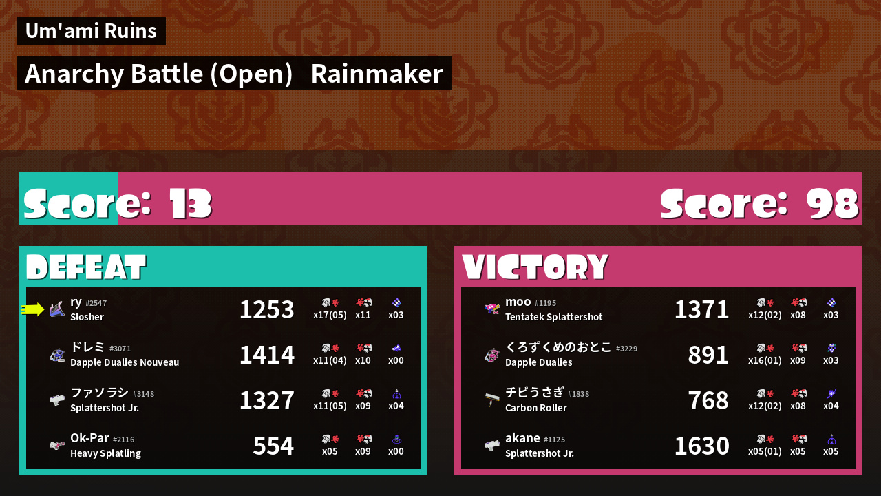 Kills / Deaths | 12 + 5 / 11 > Kill Ratio: 1.09 | ||