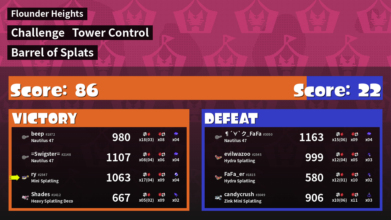 Challenge | Barrel of Splats Muster as much firepower as you can<br />in this battle of the splatlings! | ||