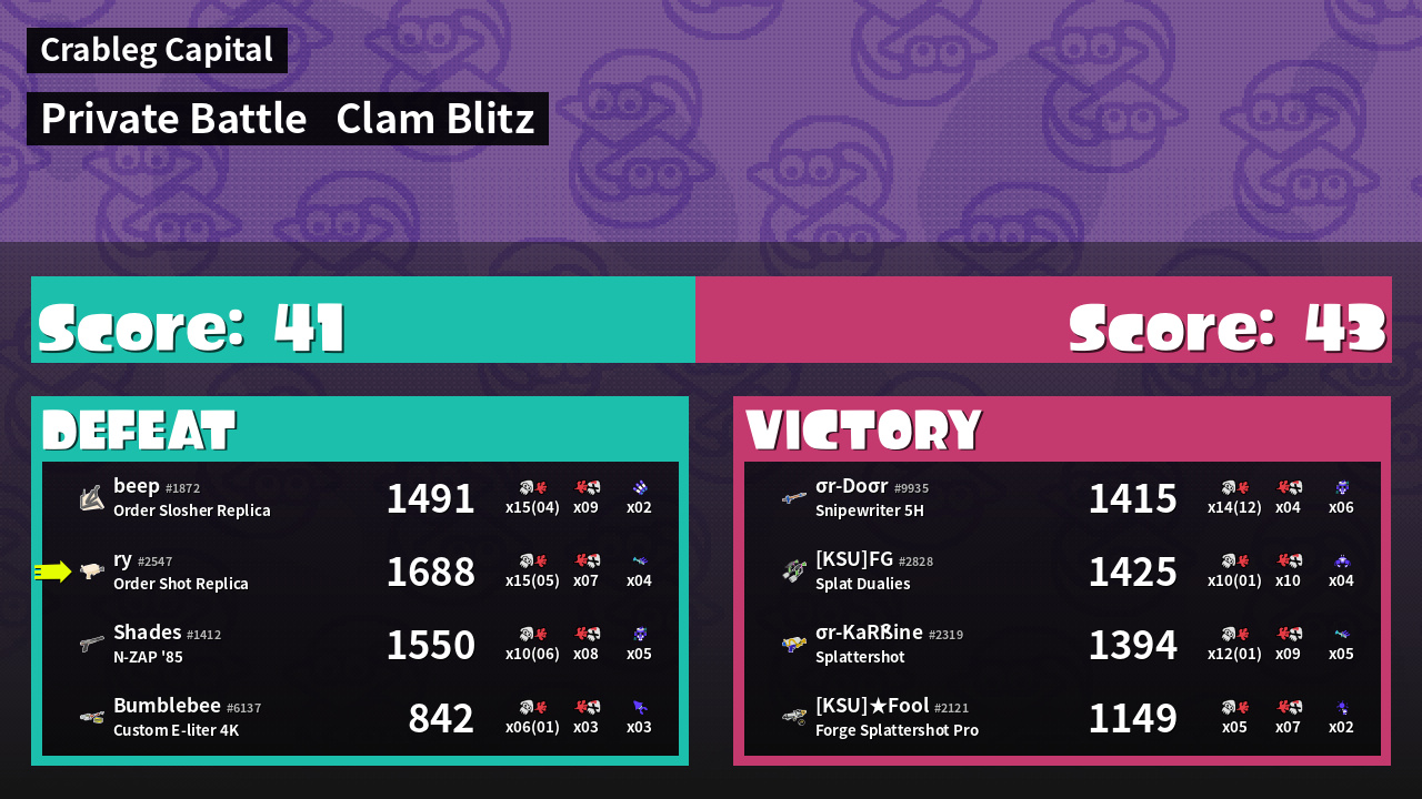 Kills / Deaths | 10 + 5 / 7 > Kill Ratio: 1.43 | ||
