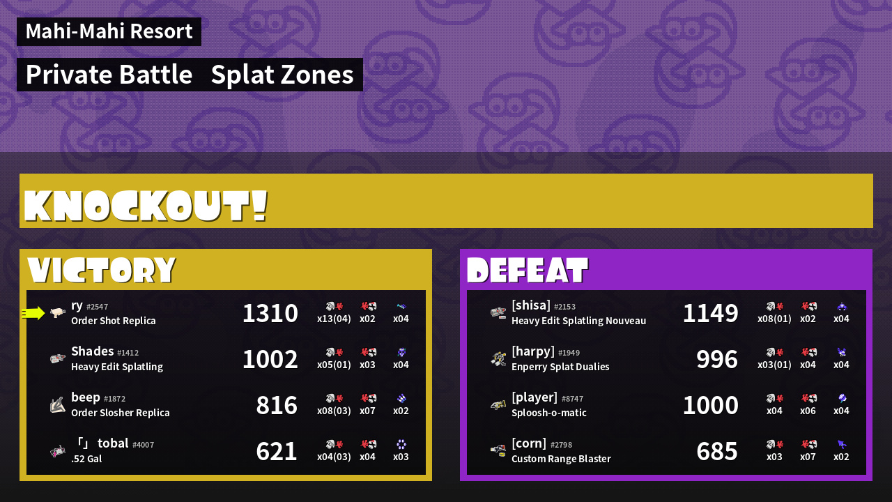 Kills / Deaths | 9 + 4 / 2 > Kill Ratio: 4.50 | ||