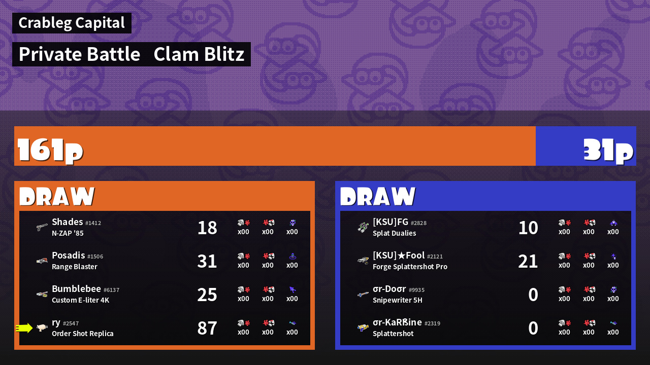 Kills / Deaths | 0 + 0 / 0 = Kill Ratio: 1.00 | ||