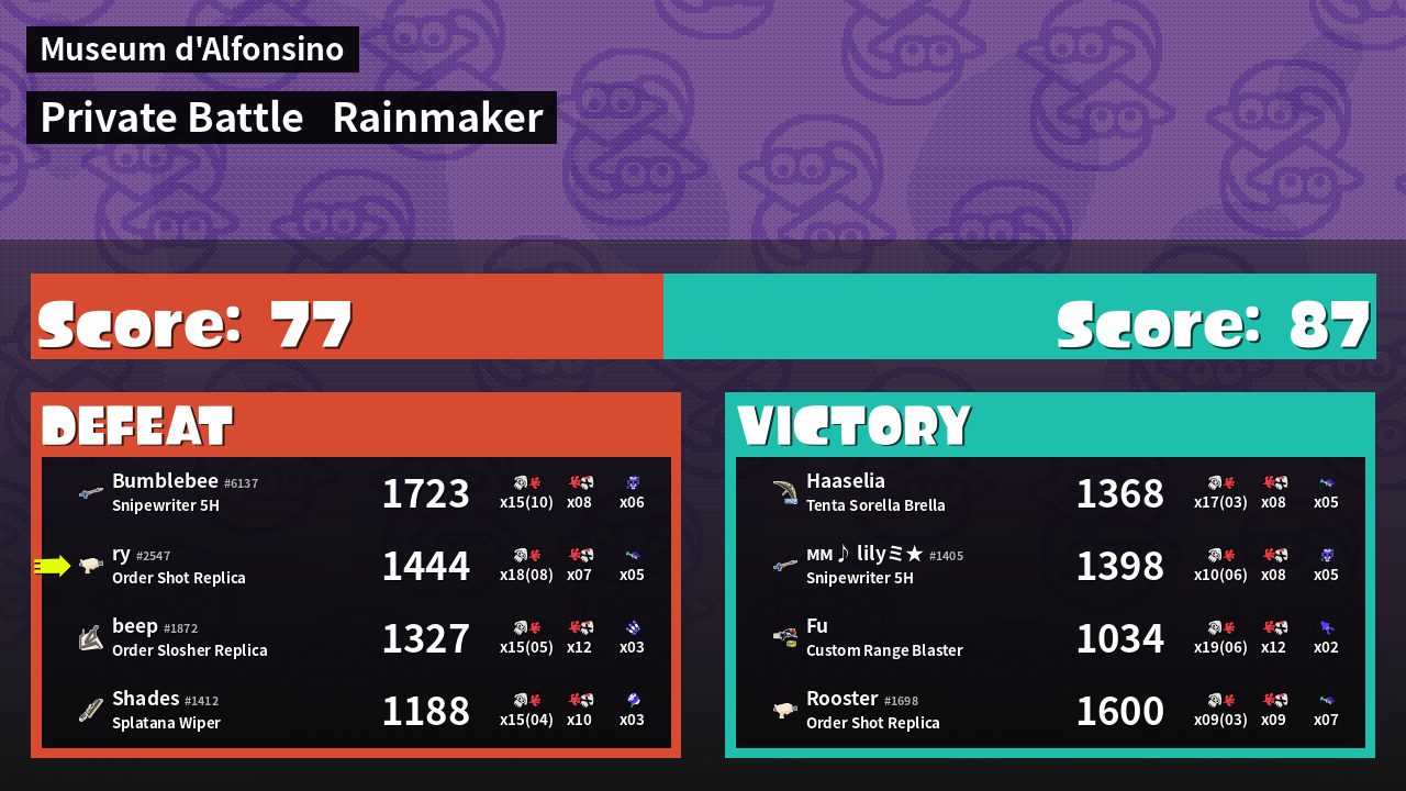 Kills / Deaths | 10 + 8 / 7 > Kill Ratio: 1.43 | ||