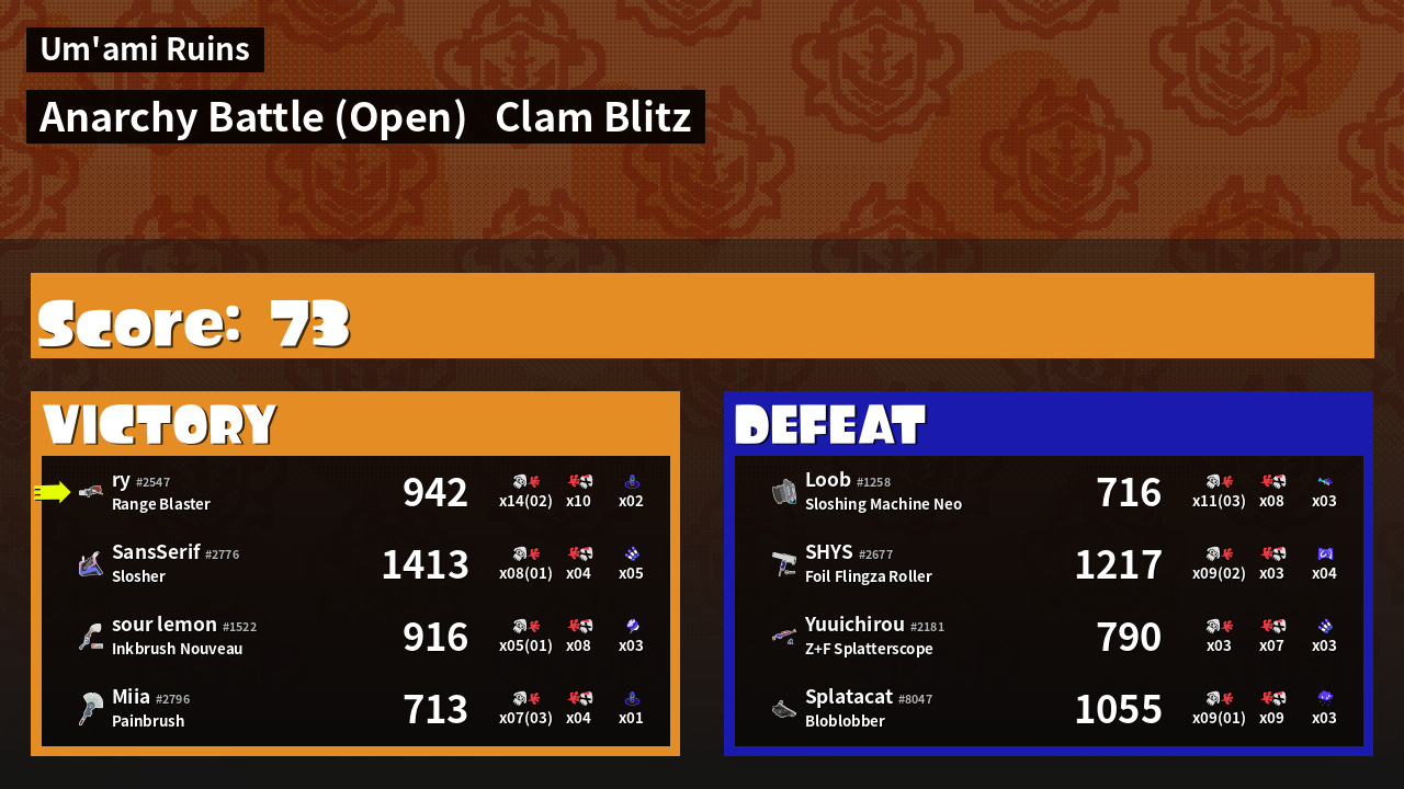Kills / Deaths | 12 + 2 / 10 > Kill Ratio: 1.20 | ||
