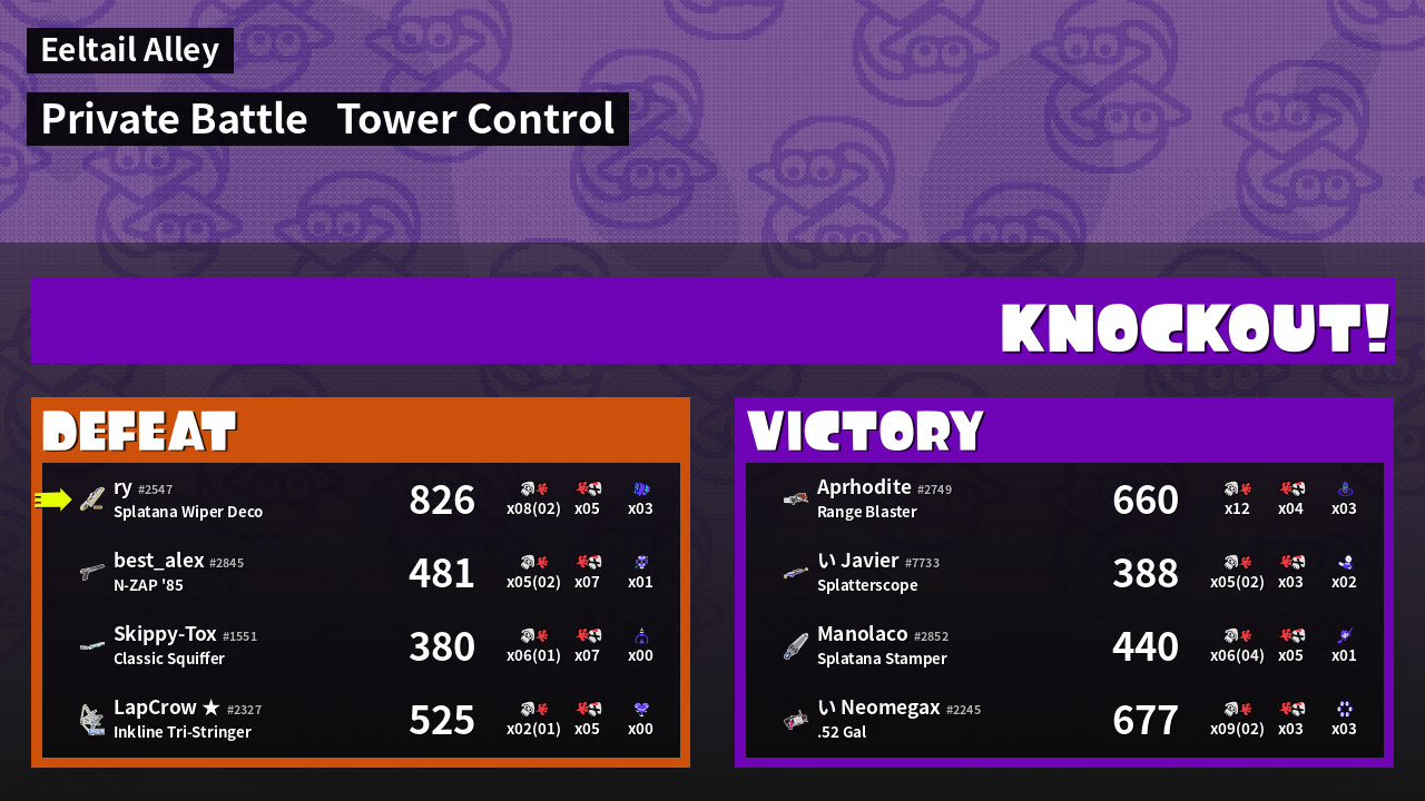 Kills / Deaths | 6 + 2 / 5 > Kill Ratio: 1.20 | ||