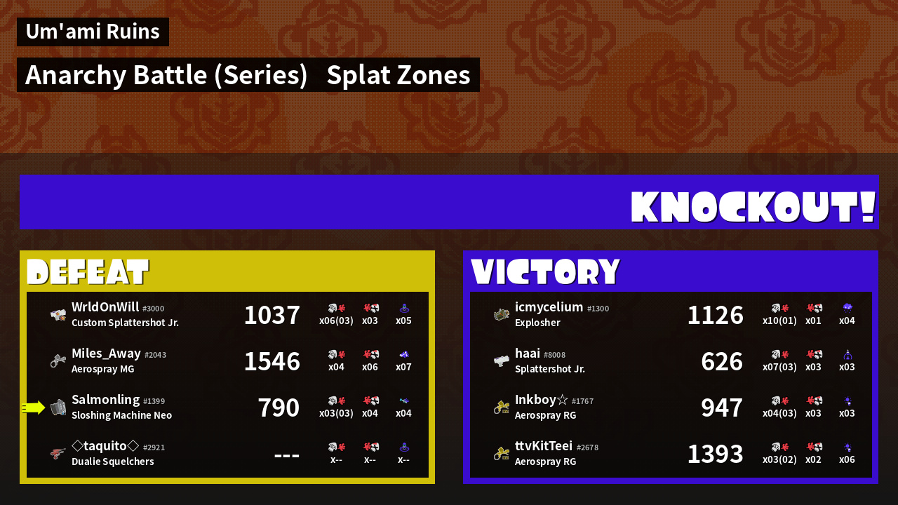 | Medals | #1 Splat Assister #2 Splat Zone Inker #2 Splat Zone Guard | ||