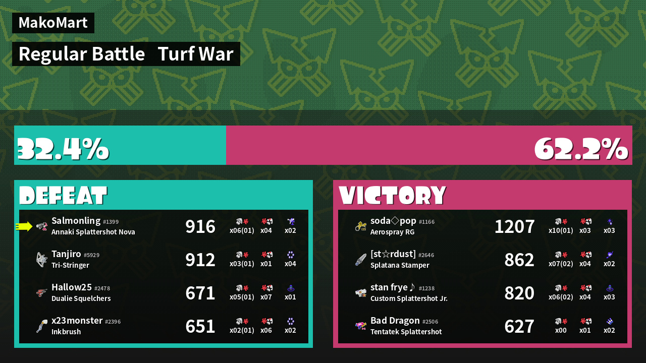 | Medals | #1 Overall Splatter #1 Turf Inker #1 Enemy Splatter | ||