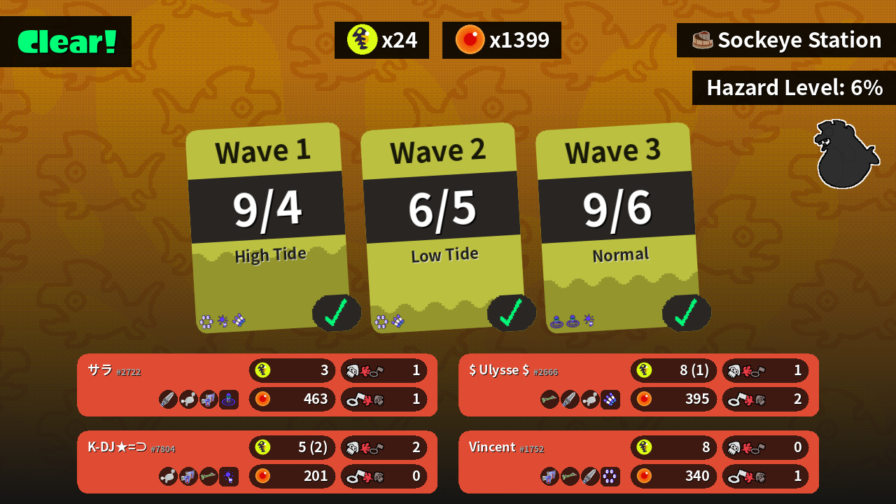 | Weapons | Splatana Stamper Luna Blaster Glooga Dualies | Bamboozler 14 Mk I Splatana Stamper Luna Blaster | Glooga Dualies Bamboozler 14 Mk I Splatana Stamper | Luna Blaster Glooga Dualies Bamboozler 14 Mk I |