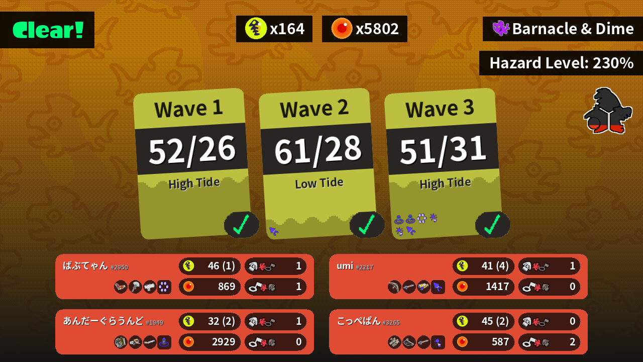 | Weapons | Hydra Splatling Painbrush Splattershot Jr. | Grizzco Dualies Bloblobber Snipewriter 5H | Tenta Brella Snipewriter 5H Splattershot | Grizzco Slosher Grizzco Blaster Classic Squiffer |