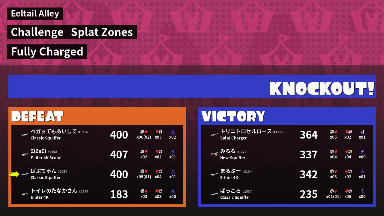 | Medals | #1 Enemy Splatter #1 Splat Zone Hero #1 Ground Traveler | ||