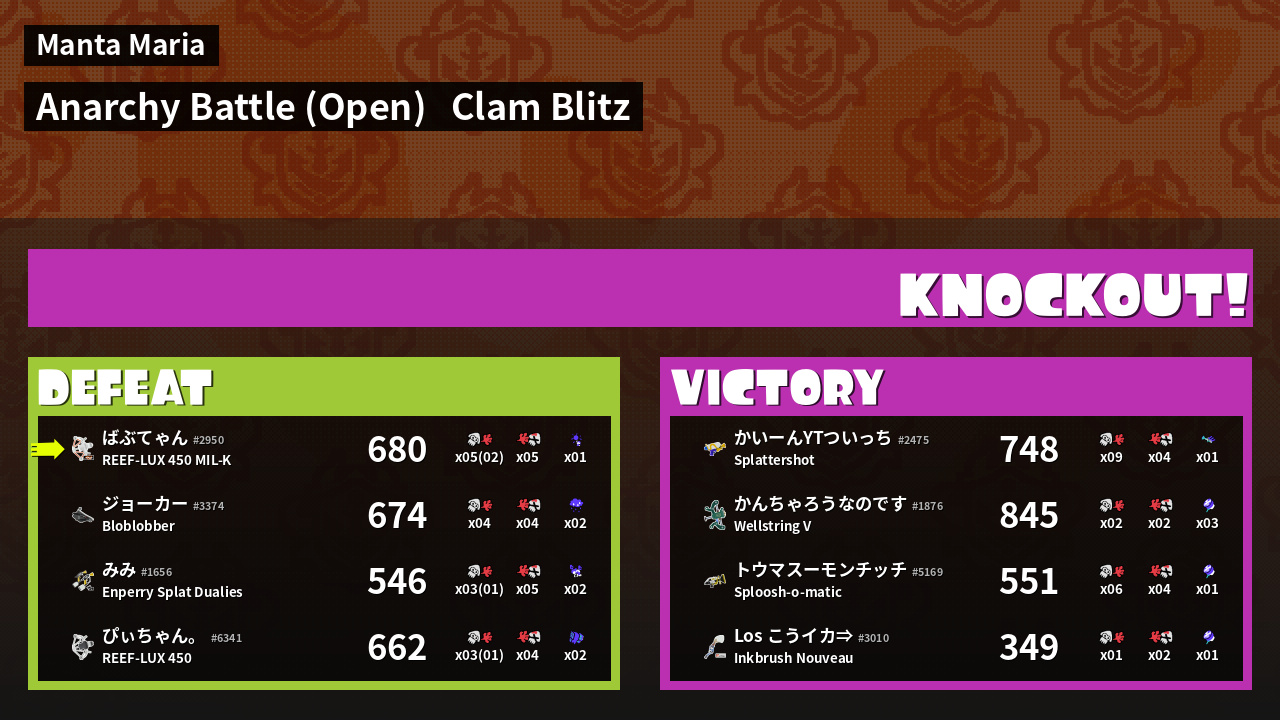 | Mode | Clam Blitz - Anarchy Battle (Open) | ||