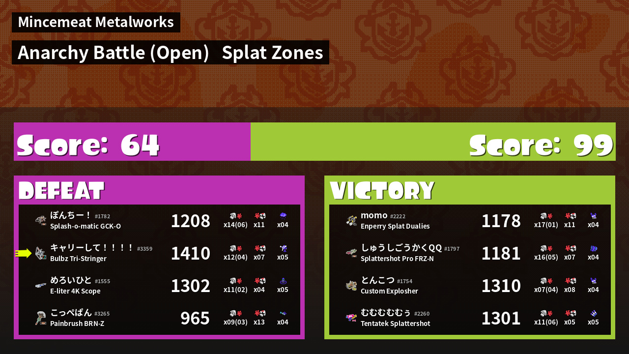 | Mode | Splat Zones - Anarchy Battle (Open) | ||