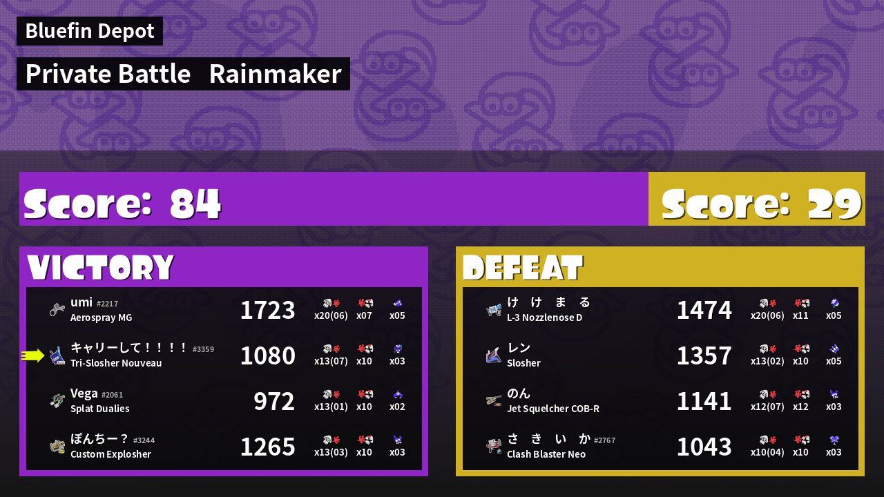 | Medals | #1 Splat Assister #1 Ink Consumer #1 Tacticooler User | ||